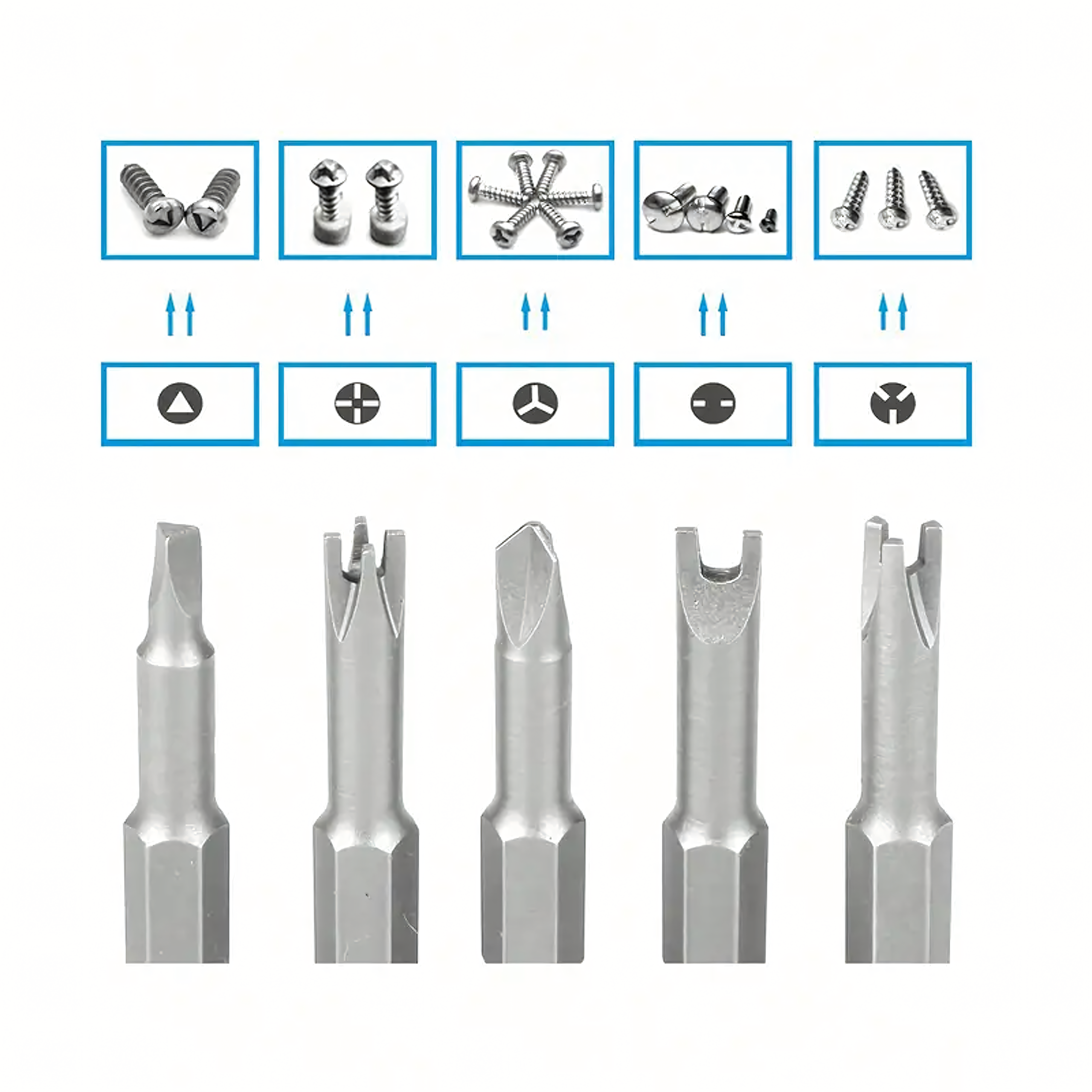 Zestaw 5 specjalistycznych bitów precyzyjnych z końcówką magnetyczną – wykonane z wytrzymałej stali CR-V, idealne do pracy z nietypowymi śrubami w elektronice, AGD i urządzeniach zabezpieczających.