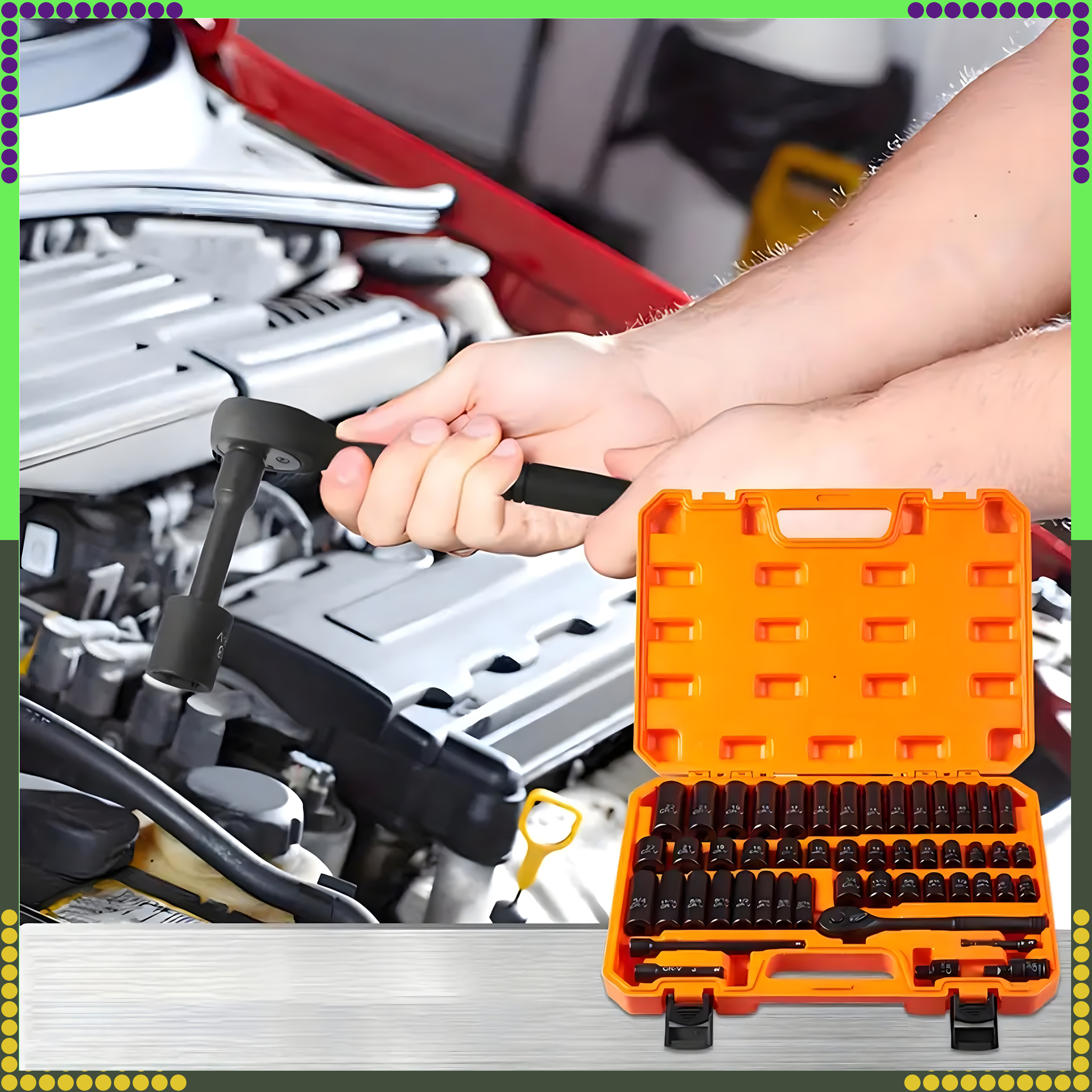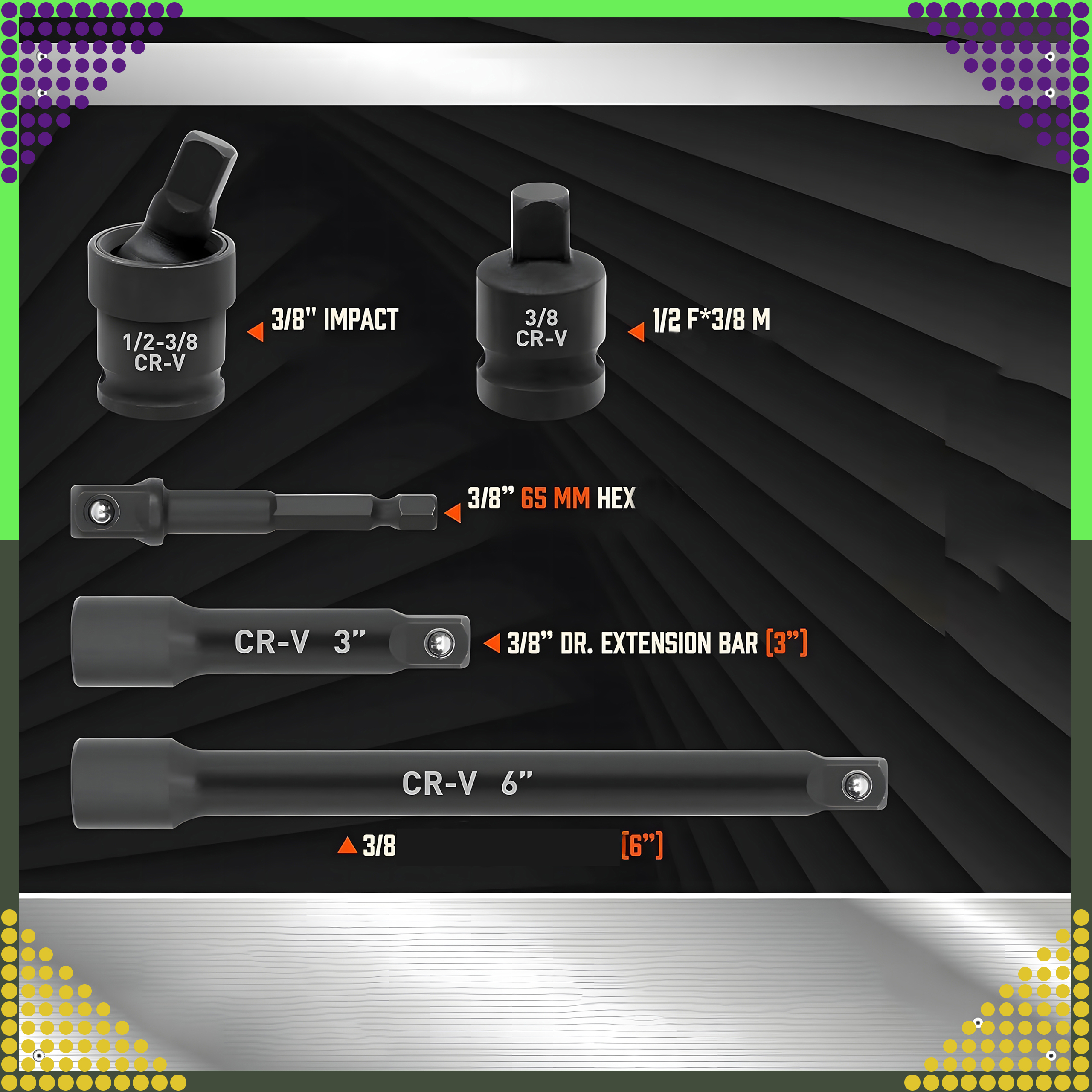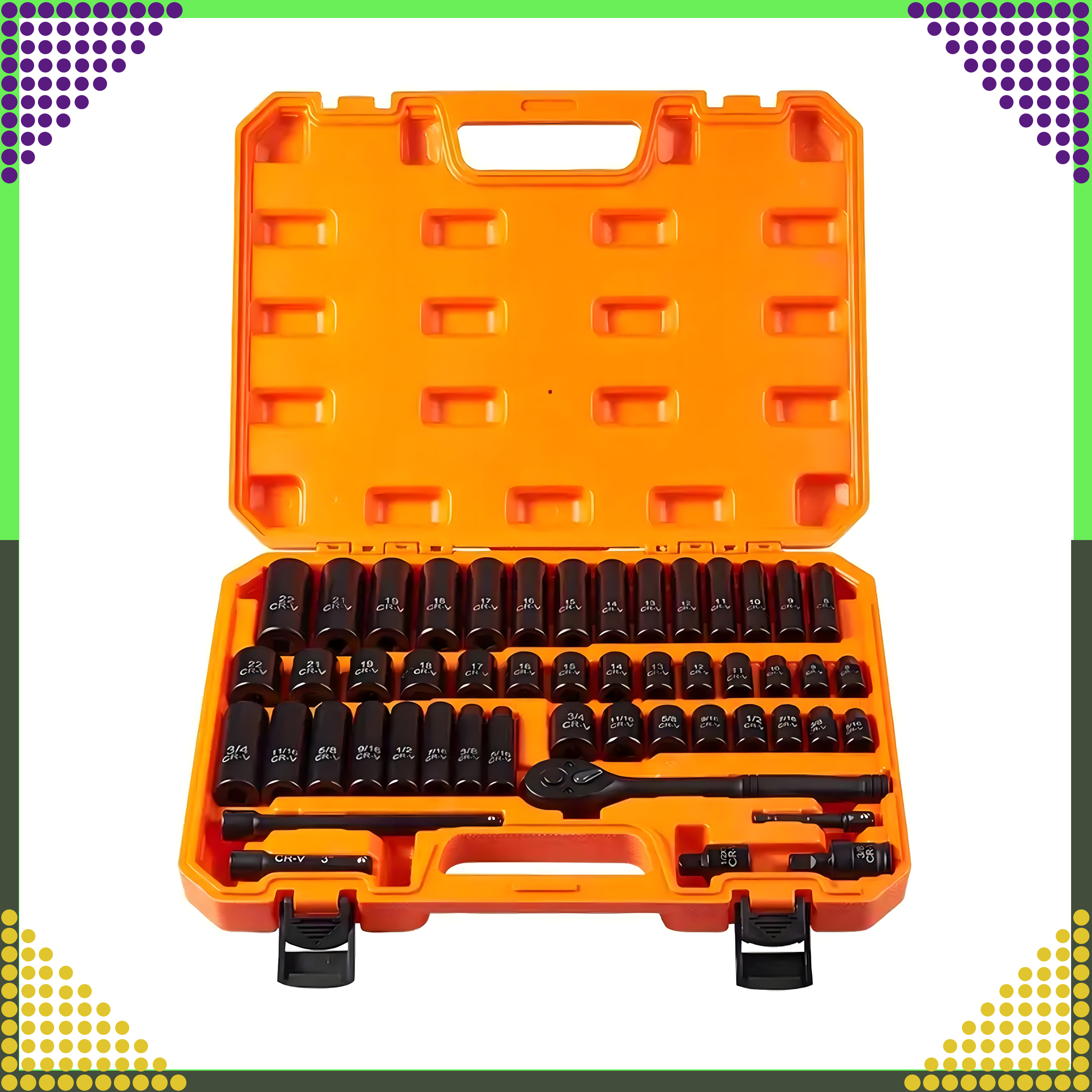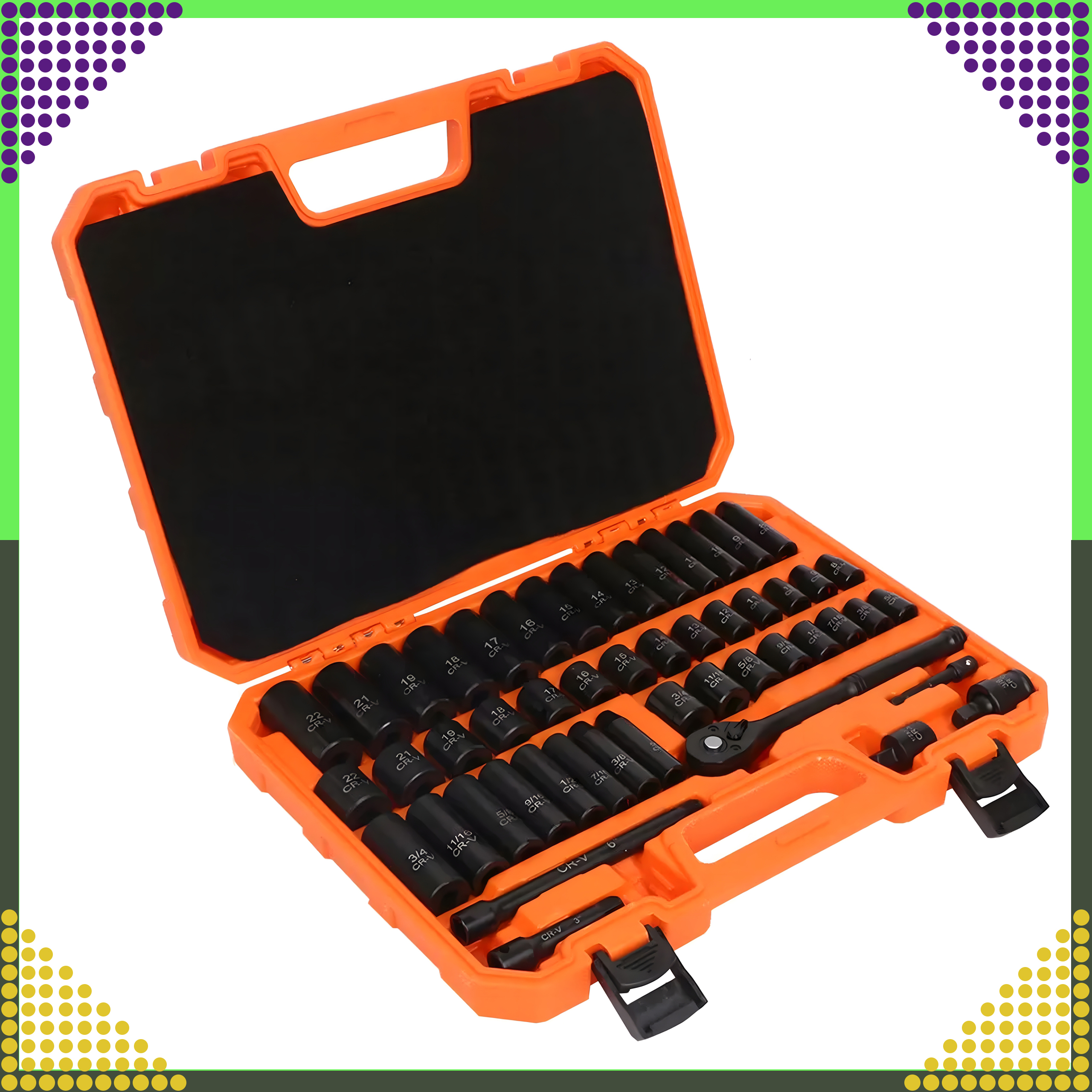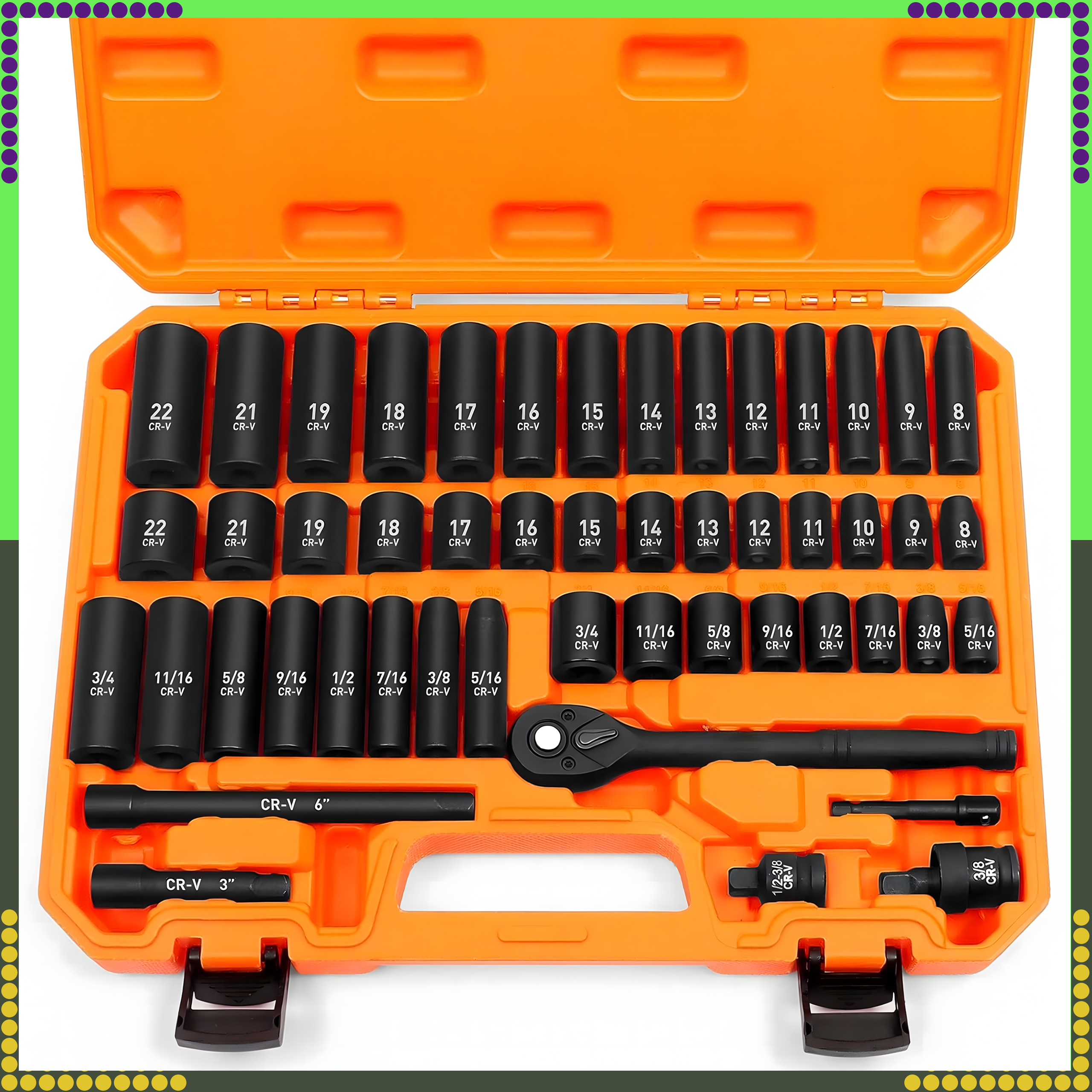 ⭐️ Zestaw Nasadek Udarowych 3/8″, 50 szt. – SAE i Metryczne, Cr-V, Grzechotka 3/8 cala, Przedłużka i Złącze Uniwersalne ⭐️