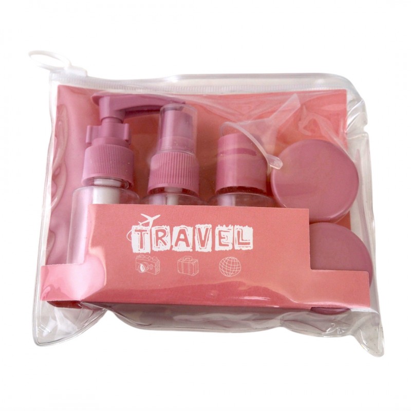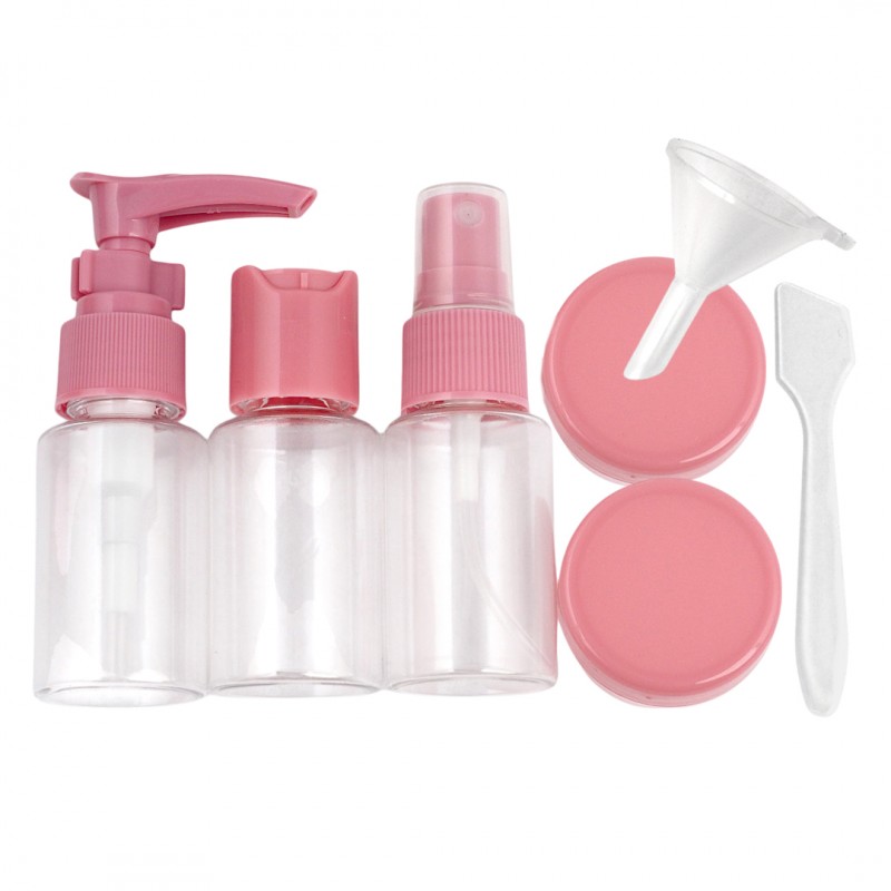 7-częściowy zestaw buteleczek i pojemniczków, specjalnie zaprojektowanych do przewożenia kosmetyków w podróży.