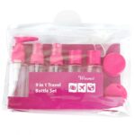9-częściowy zestaw buteleczek i pojemniczków, specjalnie zaprojektowanych do przewożenia kosmetyków w podróży.