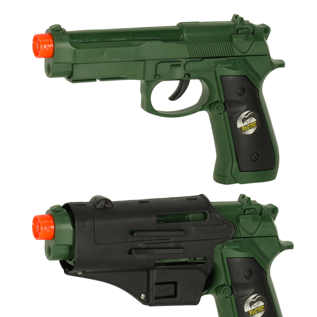 Kolory: ciemnozielony, czarny, pomarańczowy, srebrny. Materiał: trwałe tworzywo sztuczne. Wiek: 3+. Efekty dźwiękowe: tak (wystrzał i szum). Zasilanie: 3x baterie LR44 (do pistoletu, w zestawie). Liczba elementów: 10. Wymiary opakowania: 66 x 38,5 x 5 cm.