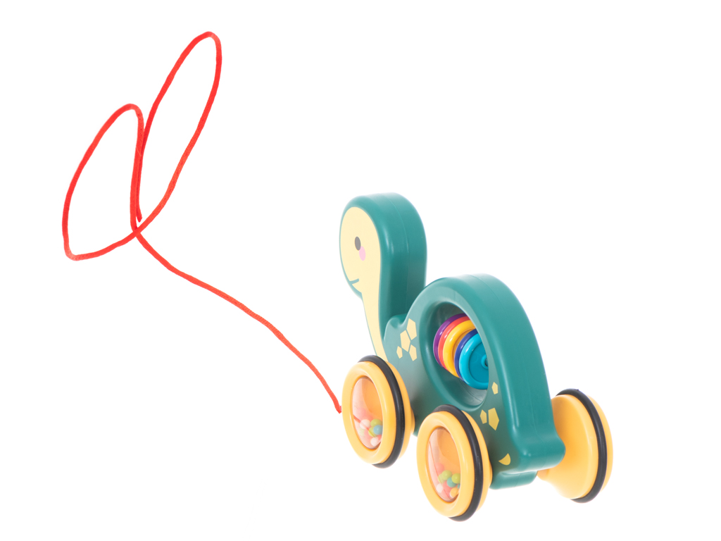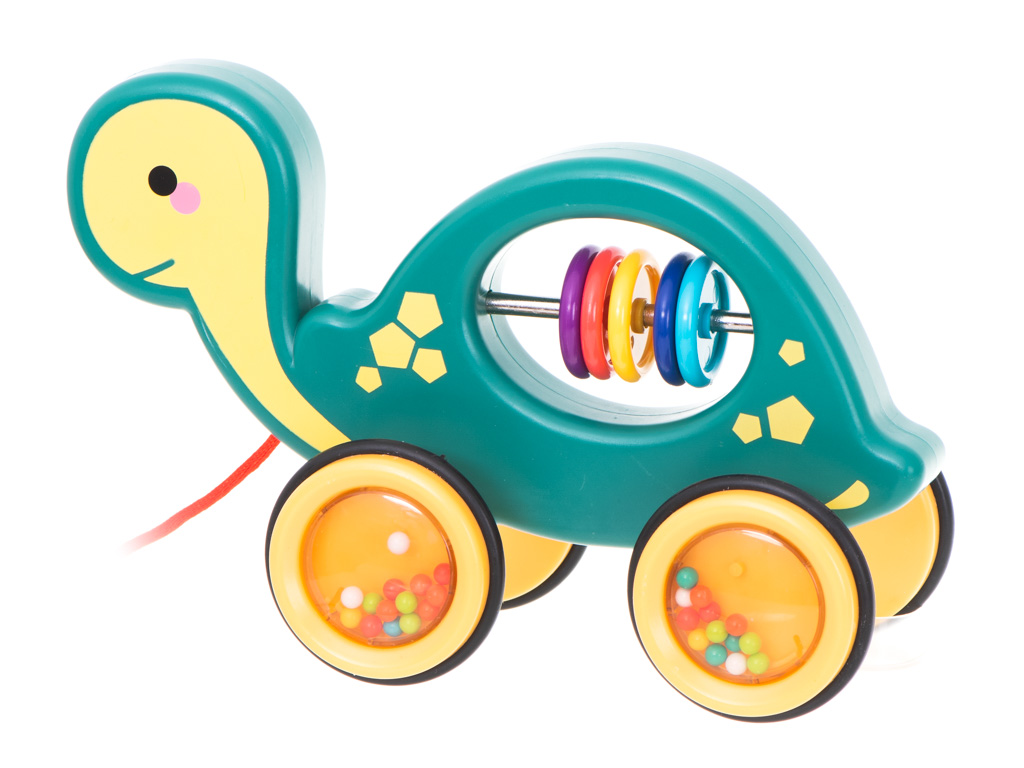 Zabawka w kształcie żółwika. W kółkach umieszczone są kuleczki, które grzechoczą podczas jazdy. Wewnątrz pięć kolorowych kółek można samodzielnie przesuwać. Długi sznurek pozwoli zabrać zabawkę np. na spacer. Wymiary żółwia: 19,5x9x12,5cm.